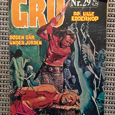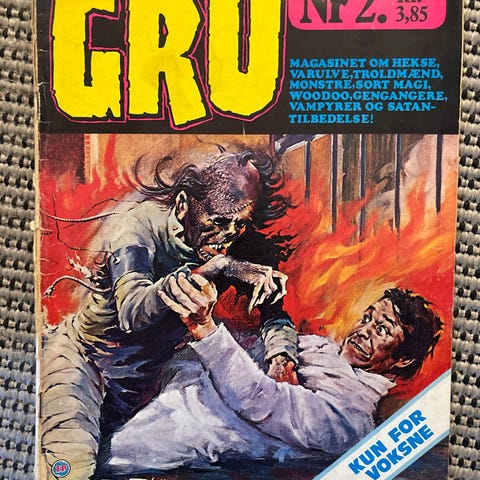 Grus magasin nr. 3 er et tegneserieblad med horror- og gysertema. Bladet indeholder forskellige historier og illustrationer i farver. Det er et fysisk magasin med slidt omslag og brugsspor, som ses på billederne.