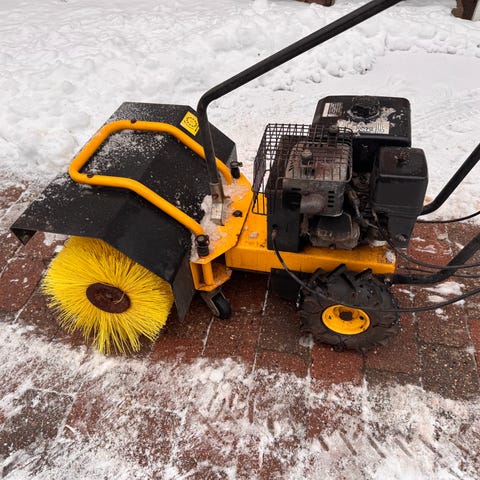 Wulff Rimas fejemaskine med roterende børste og hydrauliske tilslutninger. Maskinen er udstyret med en gul børste og en gul beskyttelsesplade. Velegnet til rengøring af veje og udendørs arealer.
