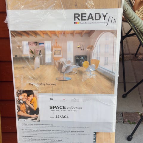 Ca. 4,5 m2. Pladerne er ubrugte, men de fleste plader har skader på selve klik systemerne på de smalle led. De sælges kun samlet.