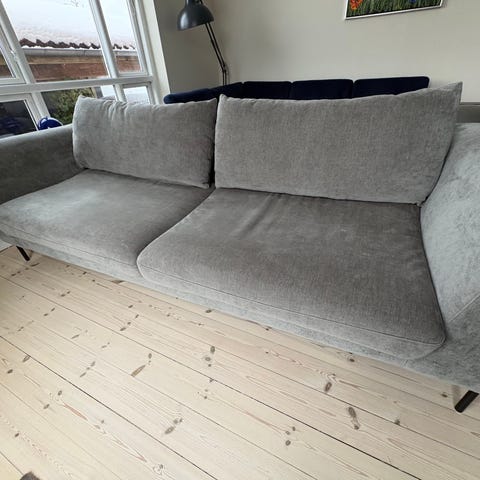 Sofa i god stand og blå/grå meleret farve og egetræs ben. Meget behagelig at sidde i.
