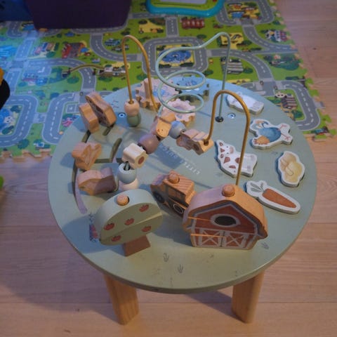 Little Dutch aktivitetsbord i træ til børn med forskellige bevægelige elementer og figurer. Bordet er designet til at stimulere motoriske færdigheder og leg. Farverne er afdæmpede og neutrale.
