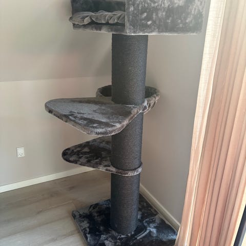 Til store katte. Meget velholdt og kun lidt brugt 2 katte stativer. Væg montering. Ligge pladser/ udsigtsplatform og kradse muligheder. Sisal søjler. Jeg har 3 ekstra plys hylder, som kan monteres på ( aldrig brugt)- kan tilkøbes. Reservedele og tilbehør kan købes på nettet.