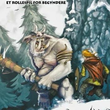 Ulvevinter Rollespil bog med illustrationer, der forestiller en stor trold og en eventyrer i et sneklædt landskab. Bogen indeholder regler og vejledning til rollespil. Sender ikke for køb under 200 kr.