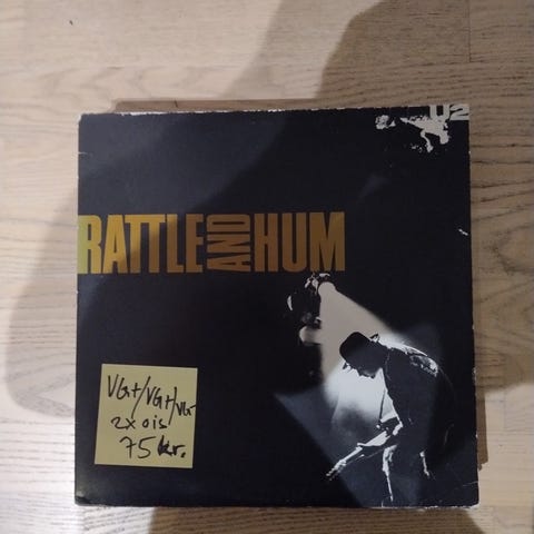 U2 Rattle and Hum vinylplade. Sort cover med orange og hvid tekst. Indeholder live- og studieoptagelser fra bandet U2.