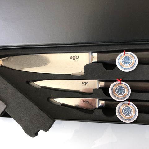 Sælger et eksklusivt EGO knivsæt i Damascus stål. Sættet består af 3 knive og fremstår som helt ny. Sælger da jeg allerede har dem.