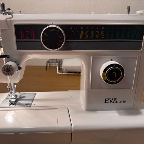 RCE symaskine med elektrisk fodpedal. Maskinen er hvid med sort panel og har indbyggede sømme. Velegnet til almindelig syning og reparation af tøj.