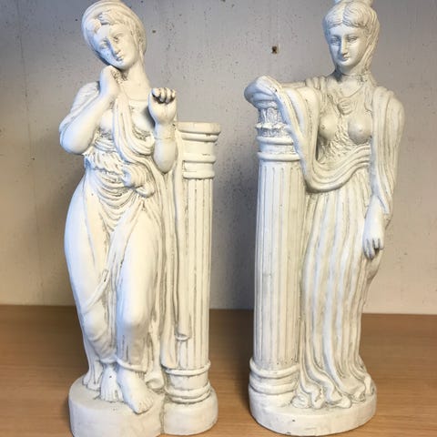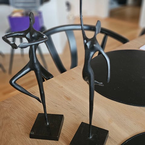 Sæt af to dekorative ballerina figurer i metal. Den ene figur er malet sort og den anden hvid. Begge står på firkantede sorte stande. Velegnet til dekoration i hjem eller kontor.