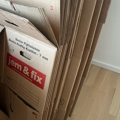 Flyttekasser 20-30 stykker, blanding fra jem & fix og Harald Nyborg. Senior Flyttekasse med ekstra kraftig kvalitet og 7 mm materiale. Designet til flytning og opbevaring med fokus på holdbarhed.