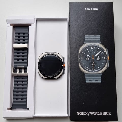 Samsung galaxy ultra 2025 smartwatch 47 mm med flere udskiftelige remme i forskellige farver og materialer. Uret er designet til forskellige remme orginale leveres med original emballage og ekstra remme i orange, grøn og beige grøn, sort farver. Remmene har forskellige lukningsmekanismer og stilarter, hvilket giver mulighed for tilpasning efter behov. Nypris er 6.500 kr orginal kvittering medfølger for 2 års Garanti. Prisen er fast