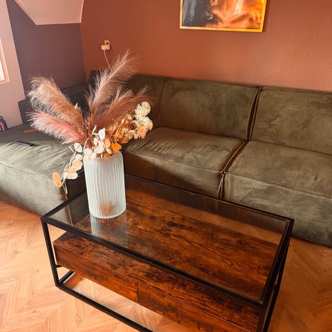 Fedt bord meg glasplade, skuffe, samt hylde.