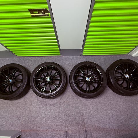 Orginale 18" BMW fælge med 245/45 - 18 Michelin Cross Climate 2 helårsdæk. 70 - 75 % mønster. Dækkene er vintergodkendt med bjergtopsymbol og produceret uge 8/22.