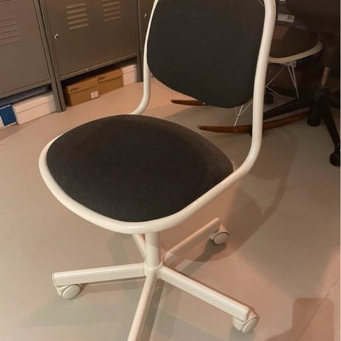 IKEA junior kontorstol med grøn polstring. Stolen har hjul og en hvid stelramme. Model 'Örfjäll'. Nypris 449,-