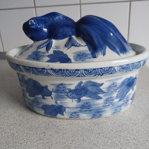 Stor flot terrin fra Knabstrup og fiskeriserien - AKSINI står bag. Låget kan også bruges som fad.