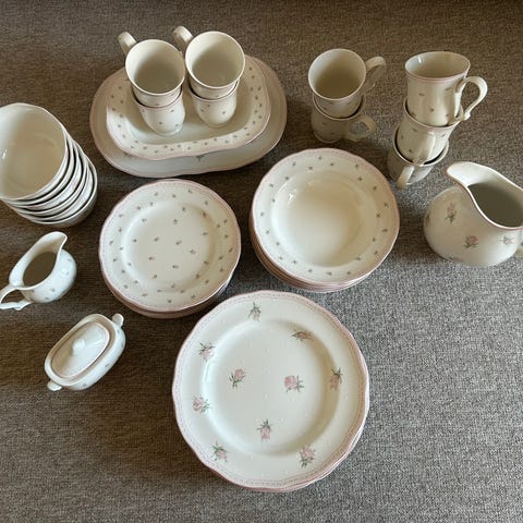 Flot og stilrent stel bestående af middagstallerkener, fade og suppeskåle i kraftig og solid kvalitet. Købt hos nordisk home