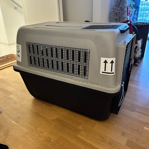 Petmate rejsebur til kæledyr med plastikramme og metalgitterdør. Buret har ventilationshuller på siderne og en bærehåndtag på toppen. Indvendigt er der en måtte og to små beholdere. Buret har en målbar størrelse med en højde cm 53 og 50 cm bredde, dybde 70cm, der passer til transport af mindre kæledyr som kat eller hund på 4-5kg , vi brugte det til at flyve vores hund ( Pomeranian ) fra Asien