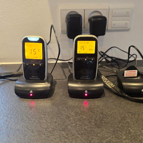 Velfungerende Neonate babyalarmer. Kan holde strøm flere dage. Kun snor i den ene, men hvilken som helst snor kan sættes i.