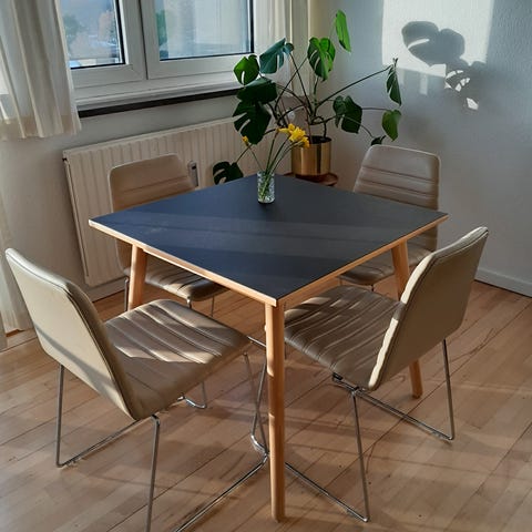 Fint egetræsbord fra Poul Volther - den har dog en “flænge” ved det ene bordben og et meget lille hak i bordpladen.