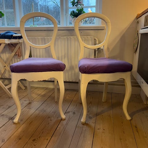 6 antikke egetræs stole, 2 med armlæn sælges samlet.
