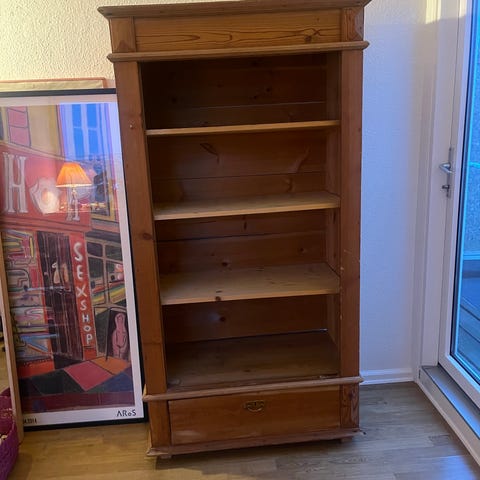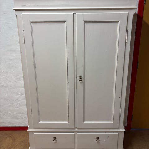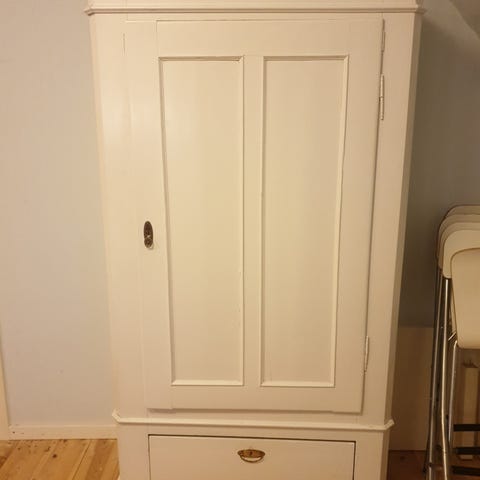 Det er et gammelt skab som er brugt. Derfor kan man godt se nogle mærker i skabet, og i hjørnet på skabet der er den også gået lidt i stykker, se billederne.
