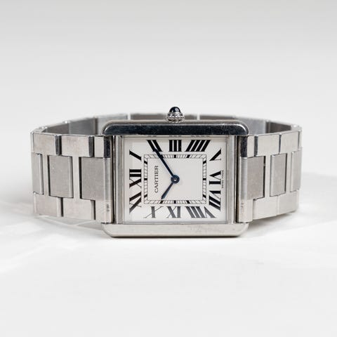 Cartier Tank ur til kvinde med rektangulært urhus og metalarmbånd. Uret leveres i originalt etui med tilhørende dokumentation.