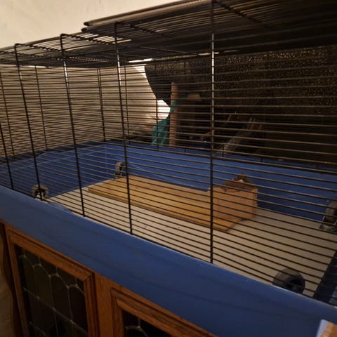 Helt nyt, kigget på men ikke samlet. Hamster, marsvine bur af fyrretræ, med skuffe og lille hule med trappe.