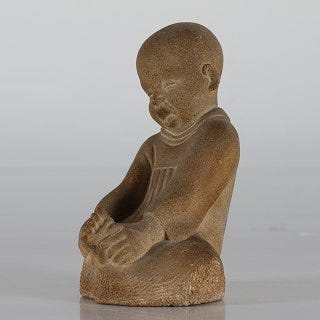 Skulptur af en kvinde siddende, udført i stenmateriale. Figuren viser en kvinde med kort hår og en kjole, der er delvist løftet. Skulpturen har en naturlig stenfarve og er detaljeret med fokus på kropsholdning og ansigtstræk.