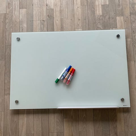 Glas whiteboard med målene 120x90 cm. Overfladen er glat og nem at rengøre.