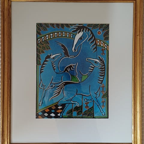 Oliemaleri, Vibeke Alfelt, motiv: Kamphæstene stil: Ekspressionisme, b: 130 h: 100, Originalt Vibeke Alfelt (f. 1934, d. 1999) oliemaleri på lærred fra 1978, komposition. Maleriet er signeret og dateret på forsiden.