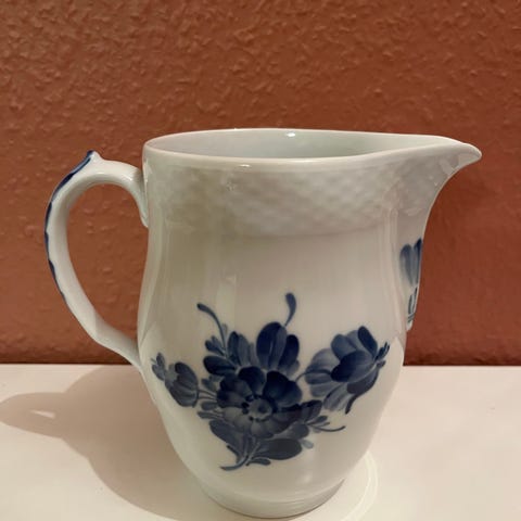 Royal Copenhagen kande med blå blomsterdekor.