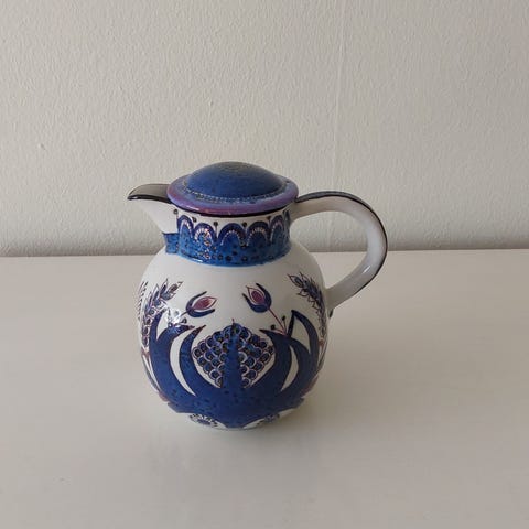 Fajance med dekorativt mønster i blå, grøn og orange farver. Kanden har en unik form med hank og er velegnet til brug i køkkenet eller som dekorativ genstand.