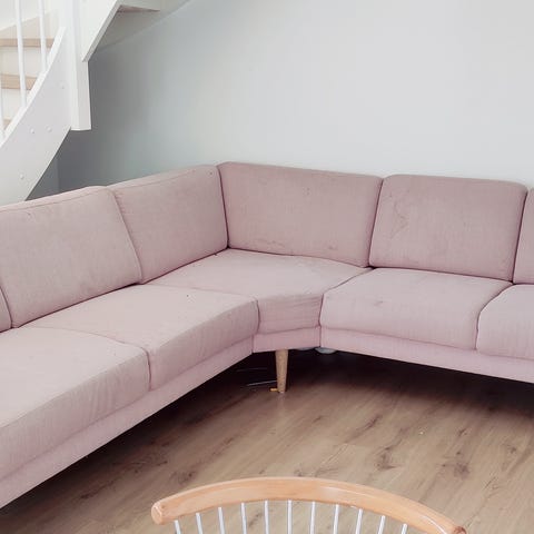 Godt brugt sofa som har brug for en god omgang tekstil rens da den var lidt skjolder. Fjederen I den ene ende i højre side giver sig lidt mere end resten. Derfor gives den gratis væk. Den er i 3 moduler og de er tunge.