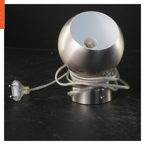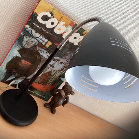 2 Bordlamper i metal. En blå og en sort. Lamperne har justerbar arm og rund lampeskærm. Designet til brug på skrivebord eller bord, egnet til fokuseret belysning.