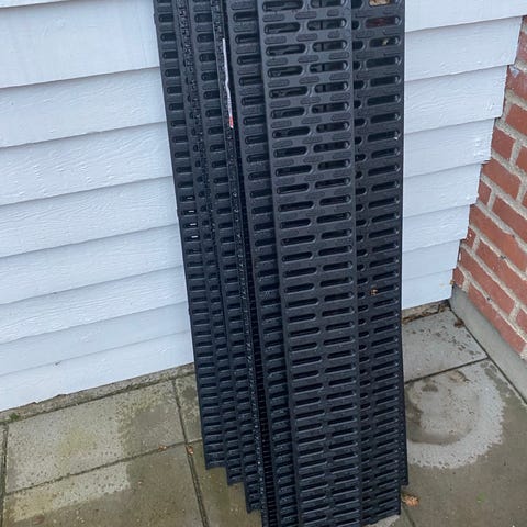 Tre gange 1m afløbsrende med riste. Endevægge mangler dog. Helt nye. Fejlkøb.