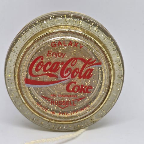 Original Coca-Cola yo-yo med klassisk rødt design og hvid kant. Produceret af Russell, Made in Philippines. Et ægte stykke retro Coca-Cola merchandise – perfekt til samlere eller som nostalgisk dekoration.