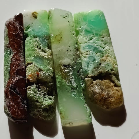 Chrysopras i bløde grønne nuancer med naturlige årer og variationer. Stenen er delvist poleret på alle sider, hvilket giver et levende udtryk, hvor både glans og rå struktur er bevaret. Overfladen er naturligt porøs enkelte steder, hvilket er typisk for chrysopras og vidner om ægte naturmateriale.