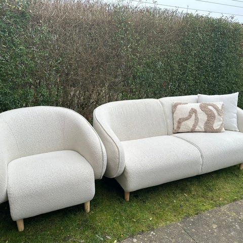 Flot og komfortabel sofa og lænestol i bouclé. Fremstår som nyt.
