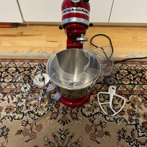 KitchenAid Artisan røremaskine i rød farve med rustfri stål skål. Inkluderer flere tilbehør som dejkrog, piskeris og fladpisker. Derudover rivejerne med 3 indsatser. Maskinen er velegnet til forskellige køkkenopgaver som æltning, piskning, blanding og råkost.