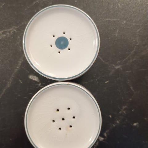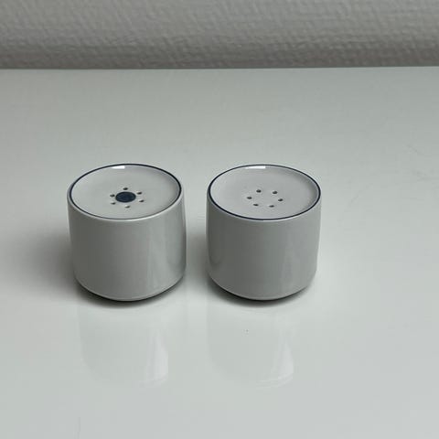 Fajance, Salt og peber, Blåkant, 2 sæt salt og peber fra Royal Copenhagen Blåkant. De er i flot stand,og sælges sætvis.