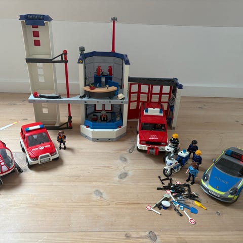 Stor Playmobil brandstation med masser af tilbehør og figurer sælges. Sættet indeholder brandstation i to etager, brandbil, redningsbåd, ATV, brandmænd, udstyr og ekstra dele (se billeder).