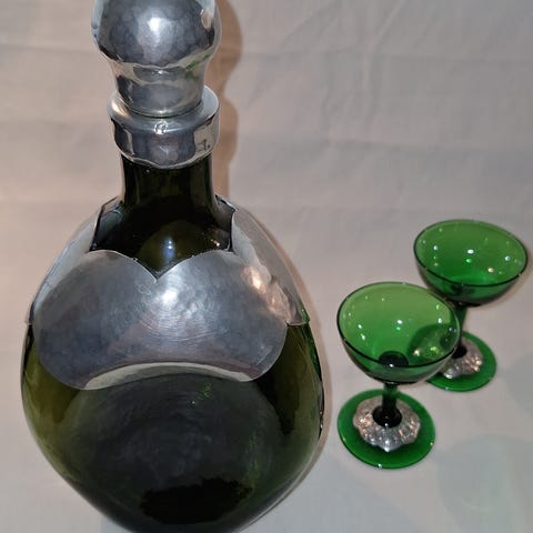Art nouveau Klukflaske i grøn med udsmykning i tin