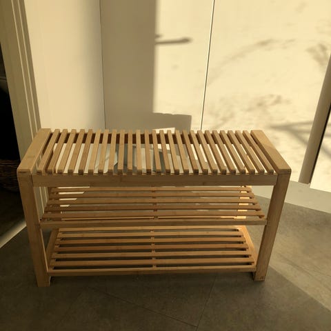 Massiv olieret eg skobænk. Fejler intet. Bredde: 75 cm, Højde: 51 cm, Dybde: 36 cm
