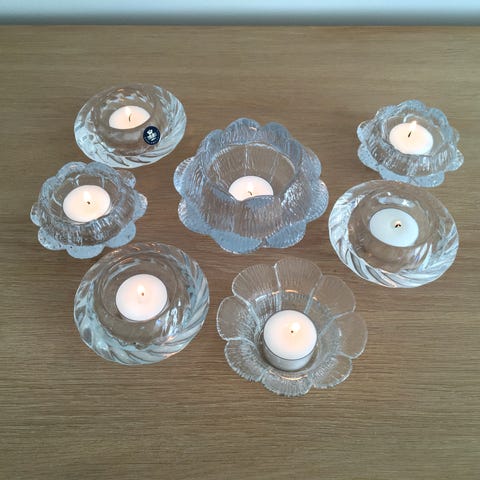 Holmegaard glas lysestager sæt bestående af 7 stk. Hver lysestage er fremstillet af klart glas med forskellige blomsterinspirerede former. Designet til at holde små fyrfadslys, velegnet til dekoration og stemningsbelysning.