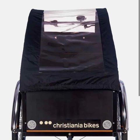 Christiania Bikes Ladcykel kaleche/regnslag til ladcykel med gennemsigtige vinduer og sort materiale.