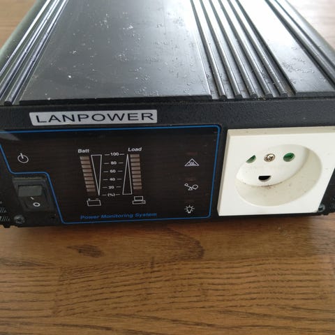 Victron Energy Inverter 12/500 med 12 V indgangsspænding og 230 V udgangsspænding, 500W effekt. Enheden har LED-indikatorer for drift, batteristatus og fejl, samt en tænd/sluk-knap.