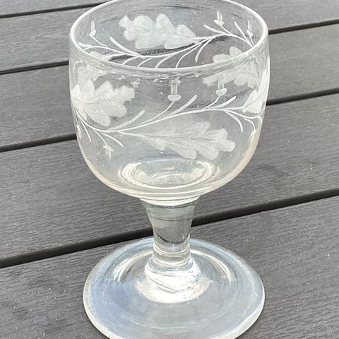 Rigtig fint vinglas med egeløv og agern. Tænker det er fra 1800 tallets slutning. Højde 11,3 cm.