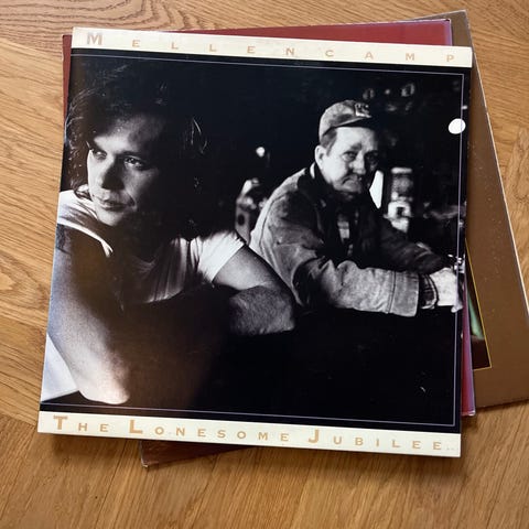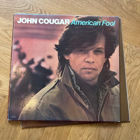 John Cougar Mellencamp Scarecrow vinylplade med cover i sort-hvidt billede. Musikudgivelse i standard LP-format.