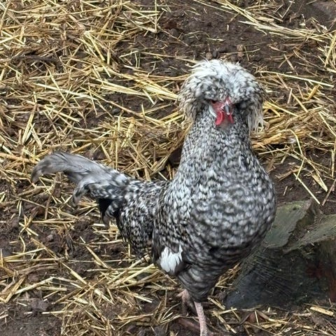 Har en smuk hane som er blandet toppet hollænder og silke. Han er ikke helt kønsmoden endnu.