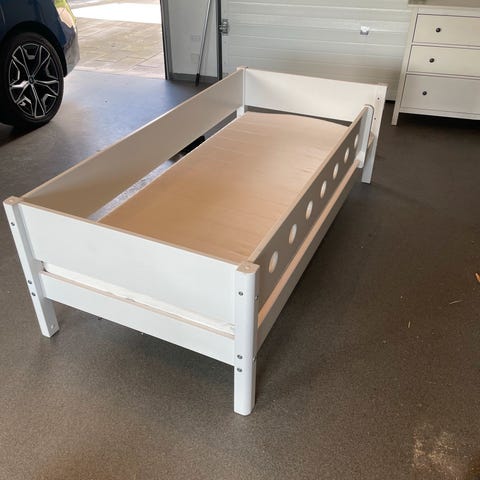 Flexa Juniorseng i str 90*200 , træet er i hvidpigmenteret , brugt men fejler intet . Lille hylde medfølger samt ro underskuffer i blå
