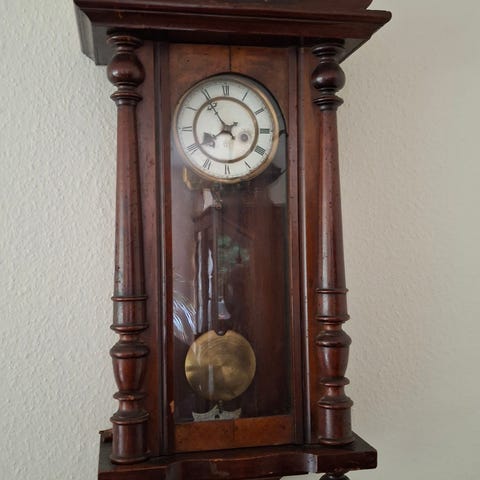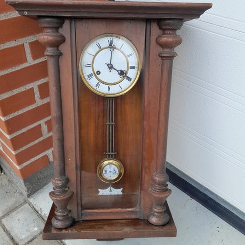 Antikt gulvstående pendul ur med hvid og guldfarvet finish. Uret har romertal på urskiven og dekorative ornamenter. Designet med en høj, smal krop og en firkantet urskive med glas. Velegnet til dekorativ brug i hjem eller samlinger.