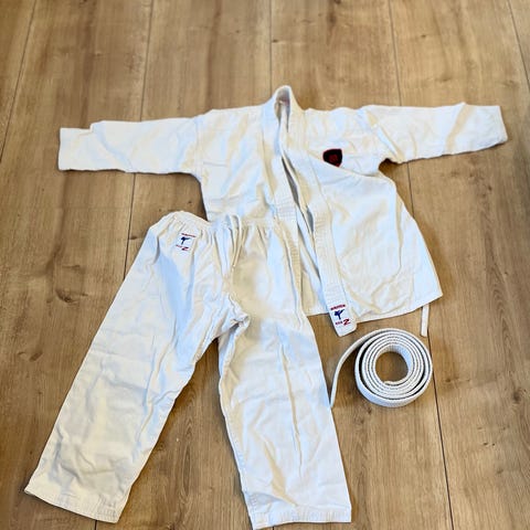 Fejler intet og fremstår meget velholdt. Størrelsen hedder 200 og svarer til en XL. Min mand som passer det er str 194 h/100 kg. Vi sælger også en børnekaratedragt til dreng/pige i str 130 ( se annonce ).